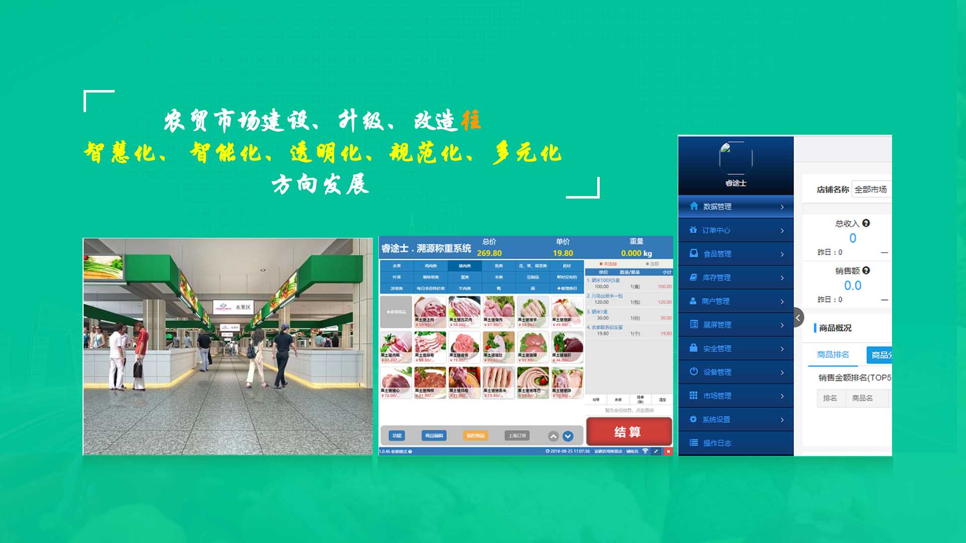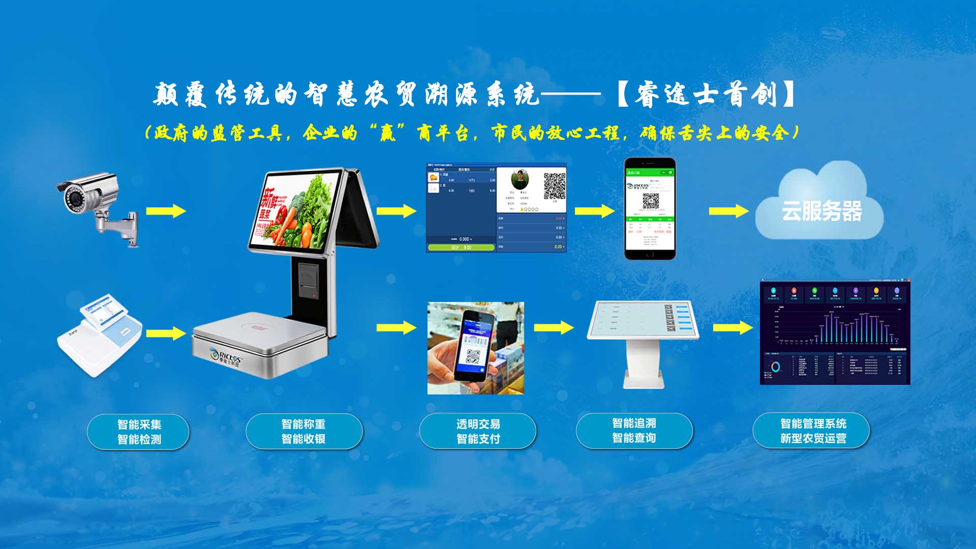 創(chuàng)新實現(xiàn)了【智慧農(nóng)貿(mào)溯源管理系統(tǒng)】與【智能稱重收銀】一體化解決方案,集市場管理、運營管理、溯源追溯、智能收銀大數(shù)據(jù)運用于一體,硬件、軟件與管理系統(tǒng)完美結(jié)合。適用于農(nóng)批、農(nóng)貿(mào)市場蔬菜、生鮮、水果、水產(chǎn)、肉類、熟食等稱重和非稱重銷售;由于采用一體化設(shè)計,解決了傳統(tǒng)農(nóng)貿(mào)市場無法實現(xiàn)的信息化、智能化、可追溯的管理問題;使稱重、收銀、追溯、管理、更透明、公正、安全,讓顧客無后顧之憂,給管理工作帶來極大的便捷與高效,對國內(nèi)農(nóng)產(chǎn)品行業(yè)的發(fā)展、農(nóng)產(chǎn)品流通管理起到了典范作用。 【睿途士首創(chuàng)】顛覆傳統(tǒng)的“智慧農(nóng)貿(mào)市場系統(tǒng)”,解決了傳統(tǒng)農(nóng)貿(mào)系統(tǒng)單一安卓掛屏,昂視不方便看、不直觀、無互動性,傳輸信息不齊全、不穩(wěn)定的問題,也解決了按鍵電子秤商品難找、商品代碼難記、按鍵操作不靈活、支付不智能,對收銀管理、銷售商品、菜名、菜價、打折、優(yōu)惠、會員、線上下單、采購等無法實現(xiàn)實際菜品交易和追溯等問題。 更具顛覆性的是睿途士智慧系統(tǒng)擁有三大管理平臺(市場管理平臺、總部運營管理平臺、商戶后臺管理平臺)、一個可視操作前臺和三大追溯功能,讓遠(yuǎn)程管理、數(shù)據(jù)傳輸、人機互動、智能控制、移動支付、大數(shù)據(jù)、互聯(lián)通信、云端存儲、人工智能、智能城市、電子定位、智能收銀等功能得以實現(xiàn)。